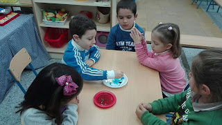 Una vez colocados en nuestros cuatro grupos nuestra nueva seño nos fue repartiendo el material que íbamos a usar, un plato de plástico blanco para ver mejor las pinturas donde íbamos a echar las diferentes leches, un plato de juguete donde puso lavavajillas y un bastoncillo de oído por equipo.